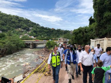 De manera puntual, el mandatario jalisciense visitó la zona donde el Río Cuale se llevó parte del puente que cruza el afluente, ahí informó que son cerca de 300 comercios y 100 viviendas afectadas.