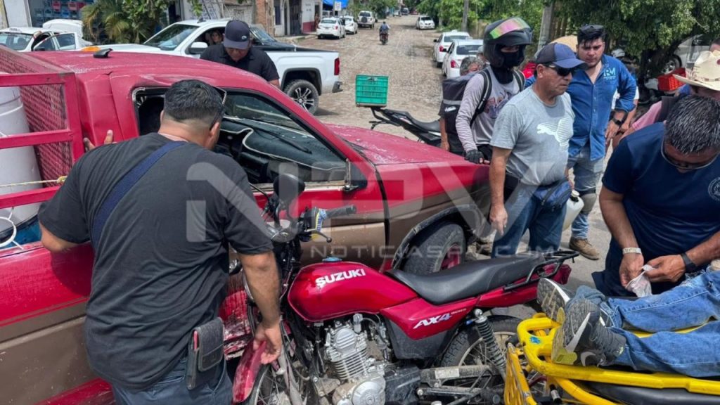 Un aparatoso choque entre una motocicleta y una camioneta registrado la mañana de este viernes sobre el bulevar principal de Rincón de Guayabitos dejó como saldo un joven motociclista lesionado y generó un fuerte congestionamiento vehicular en la zona.