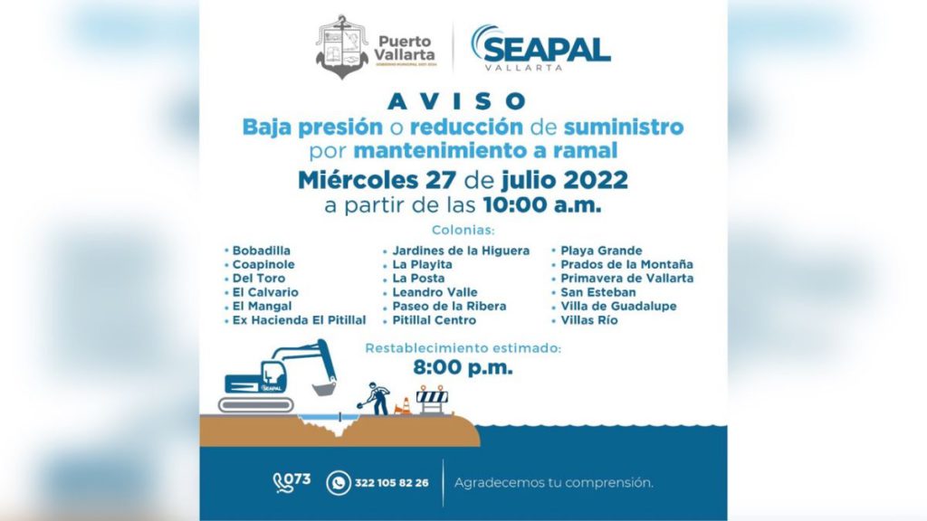 Se presentará falta de agua o baja presión este miércoles en algunas colonias de El Pitillal, como parte de la estrecha coordinación entre SEAPAL Vallarta, Gobierno Municipal y la Comisión Federal de Electricidad (CFE), este miércoles se realizarán trabajos de mantenimiento al ramal en la zona de líneas de alta tensión que abastecen de suministro eléctrico a los pozos 29 y 30 de Playa Grande.