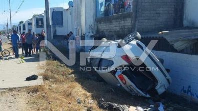 Fue sobre la carretera que lleva a San Juan donde quedó el vehículo volcado y estrellado en la barda del fraccionamiento