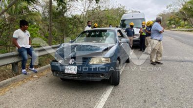 Aparatoso accidente se registró entre dos vehículos por la carretera a Punta de Mita, donde reportaron personas lesionadas que iban a bordo de un auto compacto que chocó por alcance en la parte trasera de una camioneta panel del transporte de Turismo, hasta donde acudieron los Paramédicos de Protección Civil, para auxiliar a los lesionados, pero estos ya se habian retirado por sus propios medios.