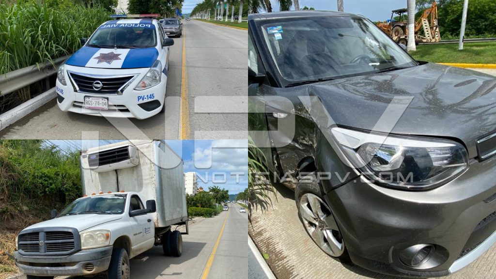 Al sitio indicado llegaron los oficiales de la Policía Vial, en sus unidades, quienes informaron a sus superiores que se trata de dos vehículos involucrados, una camioneta con termo King de color blanco del rastro Municipal y un auto Kia Soul, que chocaron al parecer por una falla mecánica que sufrió la camioneta de carga, propiedad del Ayuntamiento de Bahía de Banderas.
