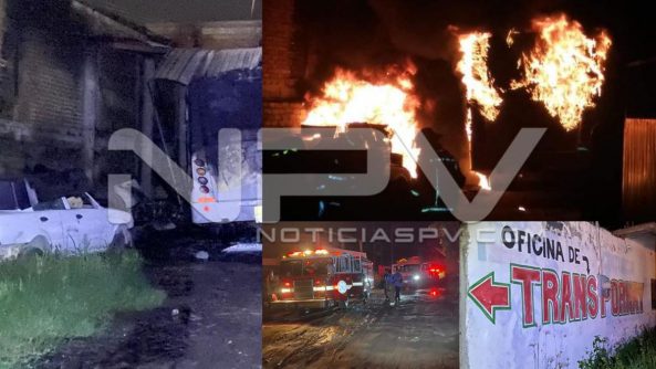 Un camión de pasajeros y un taxi junto con un auto convertible fueron los que ardieron en llamas dentro del taller que también sirve como bodega y corralon de vehículos de transporte público en Mezcales