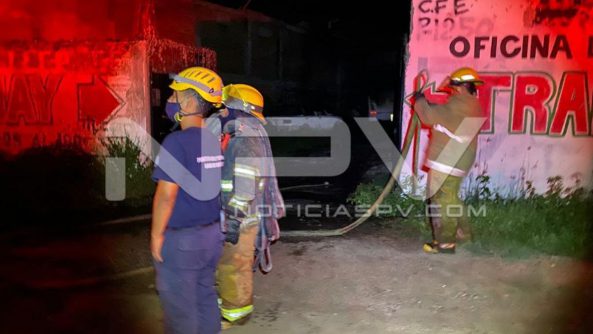 ?Momentos en que Bomberos Municipales y del Estado, intentan sofocar el fuego que arrasó con un camión de pasajeros, un taxi y un auto en un taller de TRANSPORNAY, ubicado entre Mezcales y El Tondoroque, en Bahía de Banderas, las causas de ignoran de momento.(José Luis Preciado/NoticiasPV.Com).