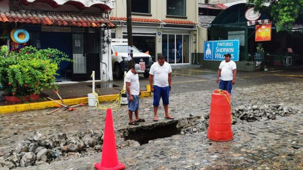 El Sistema de Agua Potable, Drenaje y Alcantarillado (SEAPAL) de Puerto Vallarta, realiza la reparación de una tubería perteneciente a un subcolector de aguas residuales en la Avenida México entre Panamá y Honduras, colonia 5 de Diciembre.
