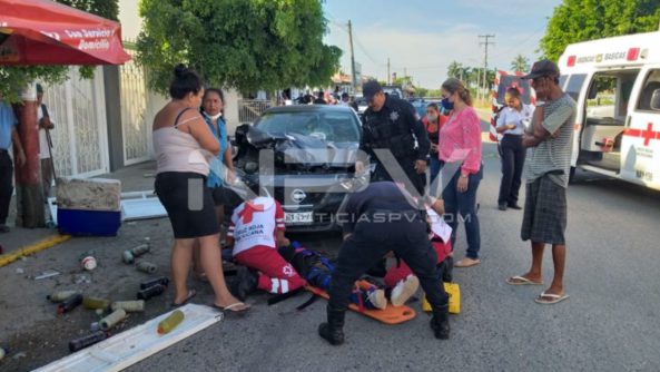 Un hombre y una adolescente resultaron con lesiones luego de ser impactados por un vehículo que chocó de frente con la parte trasera de un puesto ambulante de tacos, frente a la farmacia Guadalajara, que los aventó a varios metros donde quedaron tirados, mismos que fueron auxiliados y llevados a recibir atención médica a un hospital.
