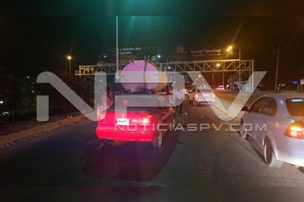 Aparatoso choque se registró en el puente Marlín, en Bahía de Banderas entre un auto y una pipa, donde afortunadamente no se reportaron personas lesionadas, pero sí cuantiosos daños materiales.