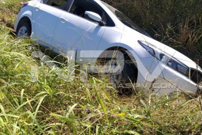 Aparatoso accidente se registró por la carretera del camino viejo, en el tramo de San Juan de Abajo, a Valle de Banderas, donde un auto se salió de la carpeta asfáltica y cayó a una canaleta de riego agrícola, donde afortunadamente no se reportaron personas lesionadas, solo daños materiales.