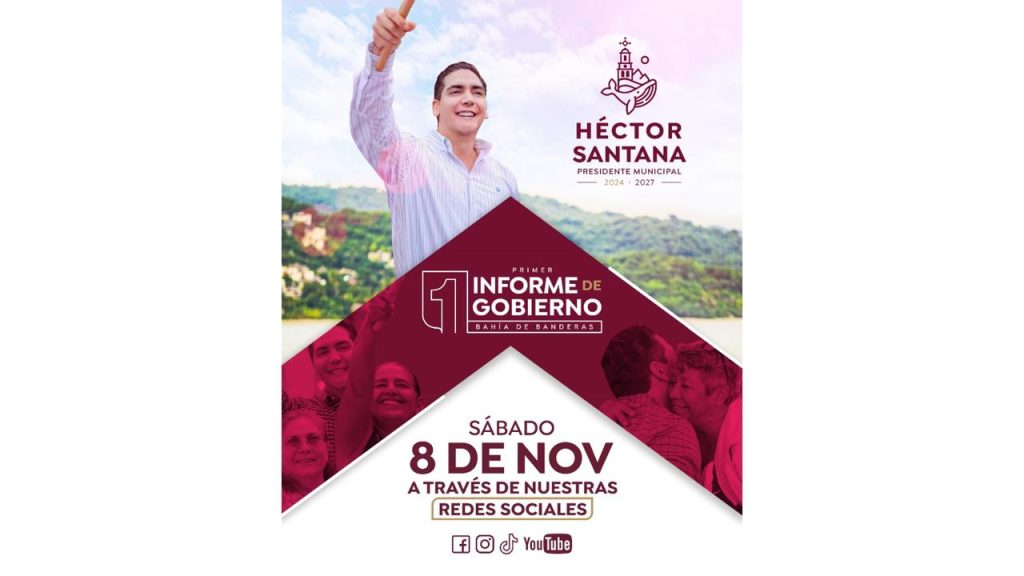 El presidente municipal Héctor Santana García presentará su Primer Informe de Gobierno este sábado 8 de noviembre en punto de la 1:00 p.m., donde dará a conocer los principales logros y resultados obtenidos durante su primer año de administración al frente del H. XII Ayuntamiento de Bahía de Banderas.