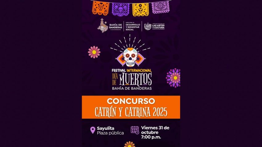 En el marco del Festival Internacional del Día de Muertos Bahía de Banderas 2025, el H. XII Ayuntamiento, que encabeza el alcalde Héctor Santana, a través del Instituto Municipal de las Artes y Cultura, en coordinación con la Dirección de Desarrollo y Bienestar Social, lanzó la convocatoria para participar en el Concurso de Catrín y Catrina 2025, que se llevará a cabo el próximo viernes 31 de octubre a las 7:00 p.m. en la plaza pública de Sayulita.