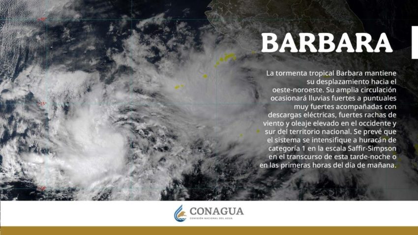 Con vientos sostenidos de hasta 95 km/h y rachas de 110 km/h, Bárbara avanza hacia el oeste-noroeste a una velocidad de 19 km/h. El Servicio Meteorológico Nacional informó que se espera que la tormenta se intensifique a huracán categoría 1 en la escala Saffir-Simpson durante la tarde-noche de este domingo o en las primeras horas del lunes.