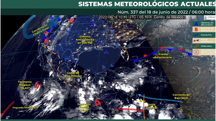 Los ciclones que mantienen una incidencia directa sobre el territorio mexicano se degradaron, Blas bajó de huracán categoría 1 a tormenta tropical, mientras que Celia pasó de tormenta a depresión tropical. No obstante, las lluvias continuarán con una fuerte intensidad en los estados costeros del Pacífico y algunos más de la Península de Yucatán.