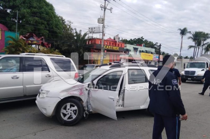 Aparatoso choque se registró en el semáforo del Decameron, donde dos vehículos chocaron entre sí, afectando también una tienda Oxxo, tomando nota los agentes viales, quienes se hicieron cargo del accidente.