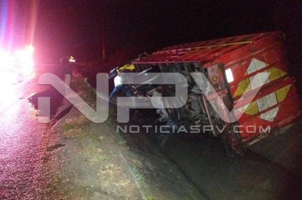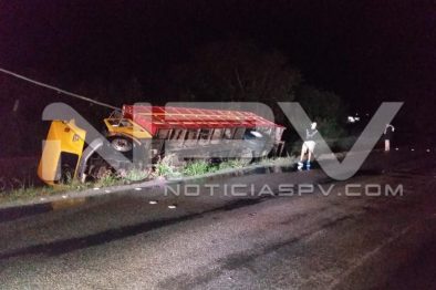 Aparatoso accidente se registró la noche de este domingo sobre la carretera vieja Bucerías-Valle, en donde un camión tipo torton, cargado con ganado, cayó a un canal de riego, provocando que el mismo se volcara.