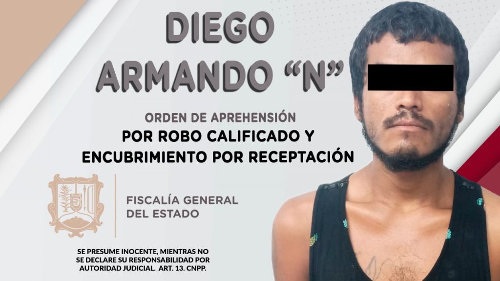 Comunicado.- En la zona Centro del poblado Valle de Banderas, municipio de Bahía de Banderas, elementos de la Agencia de Investigación Criminal dieron cumplimiento a una orden de aprehensión contra Diego Armando “N”, por su probable responsabilidad penal en hechos que para la ley constituyen los delitos de encubrimiento por receptación y robo calificado.