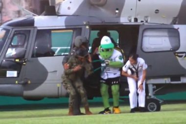 Usan helicóptero de la Marina para trasladar a “Pochi”, mascota de los Olmecas de Tabasco (Video)