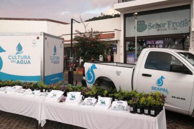 Con plantas y playeras con el mensaje de vida y conservación “con una gota la…