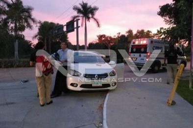 Elementos de los servicios de emergencias y los agentes viales acudieron a tomar nota de un accidente ocurrido cerca del puente peatonal de Flamingos en Bucerías, donde resultaron cuantiosos daños materiales y una mujer lesionada que fue atendida por paramédicos de un hospital particular.