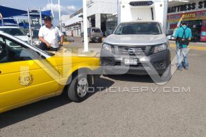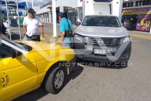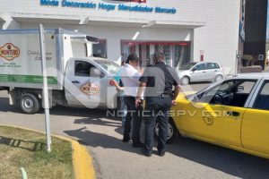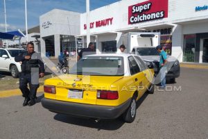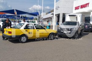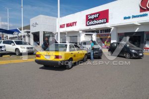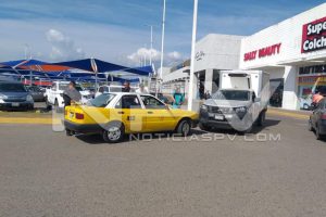Taxi blanco y amarillo chocó contra una camioneta en el estacionamiento de Walmart donde solo resultaron daños materiales, tomando nota los agentes de la Policía Estatal Preventiva, quienes se econtraban cerca del lugar y fueron testigos del accidente donde no hubo necesidad de la presencia de los agentes viales, ya que los involucrados se arreglaron entre ellos.