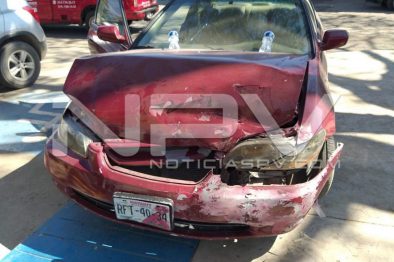 Hasta ese sitio se dirigieron los oficiales de la Policía Vial, a bordo de sus unidades el mando del comandante en turno Grimber Ayon, Rolon, quienes al arribar se percatan del accidente y luego informan a su base operativa que se trata de dos vehículos involucrados, siendo como presunto responsable uno de la marca Honda, de color tinto, con placas de circulacion RFT-40-34 de Nayarit, que se impacta por la parte trasera de un auto Chevrolet, tipo Aveo, con las metalicas RGT-76-06.