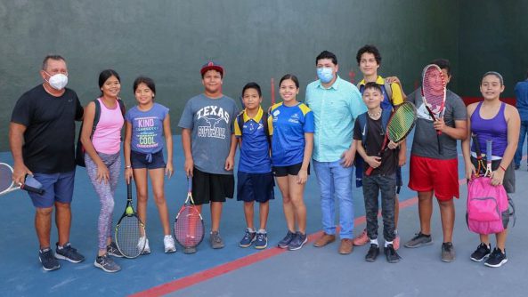 El presidente municipal interino, junto a la pentacampeona de frontenis, Lupita Hernández, develaron una placa conmemorativa para hacer la entrega oficial de la cancha de frontenis, y posteriormente dieron el primer golpe en este espacio rehabilitado.