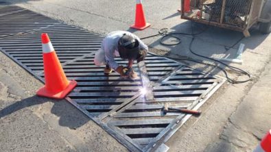 Finalmente, el equipo de soldadores repara bocas de tormenta en la entrada principal a la Delegación de Ixtapa, en atención a los reportes de los vecinos.