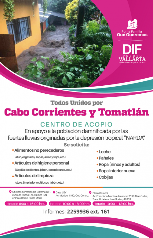 Dando continuidad a la labor que realiza el Sistema DIF, de llevar apoyo a las familias damnificadas por fenómenos naturales, la presidenta de la institución asistencial, Candelaria Tovar de Dávalos, informó que continúan abiertos los centros de acopio para ayudar a la población de Tomatlán y Cabo Corrientes, que se vio afectada por el paso de la depresión tropical ‘Narda’, en días pasados.