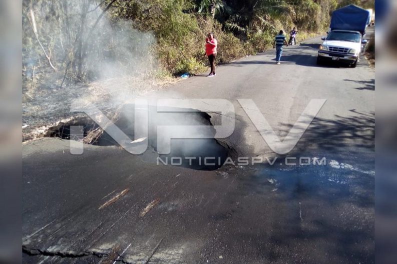 Informan las autoridades que el socavón se originó debido al incendio registrado en el cerro, provocando que la tubería se derritiera en el tramo carretero del kilometro 30+300, ubicado en la costera de Platanitos y El Llano.