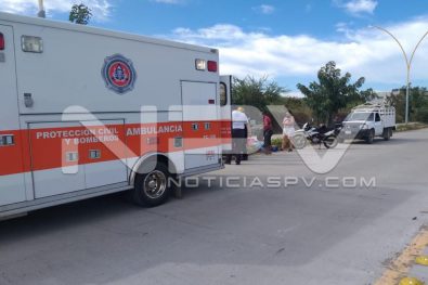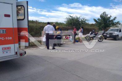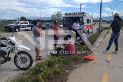 Vecinos de San Vicente, sufrieron lesiones de consideración al caer de la motocicleta en la que circulaban sobre la avenida de ingreso al edificio en construcción del nuevo IMSS en San Clemente de Lima, en Bahía de Banderas.