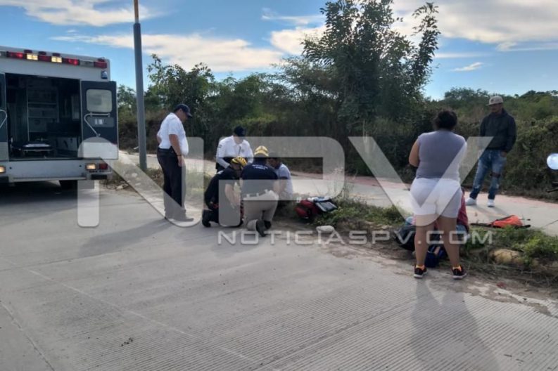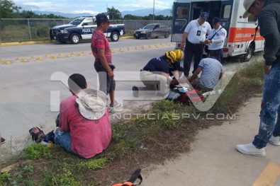 Vecinos de San Vicente, sufrieron lesiones de consideración al caer de la motocicleta en la que circulaban sobre la avenida de ingreso al edificio en construcción del nuevo IMSS en San Clemente de Lima, en Bahía de Banderas.