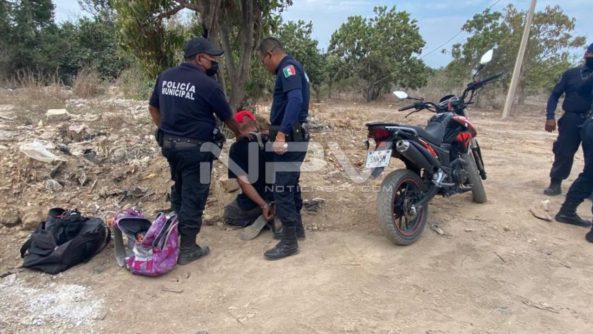 Fue en el ingreso a la colonia Emiliano Zapata, donde los agentes de la Policía Municipal, aseguraron a uno de los sospechosos sujetos, quien se tornó agresivo y fue sometido por los uniformados, quienes lo llevaron a recluir a los separos de la cárcel Publica Municipal, donde quedó a disposición de la autoridad correspondiente quienes se encargarían de realizar algunas investigaciones para después poder definir su situación legal, siendo asegurada también la motocicleta que quedó en resguardo en el corralón de gruas.