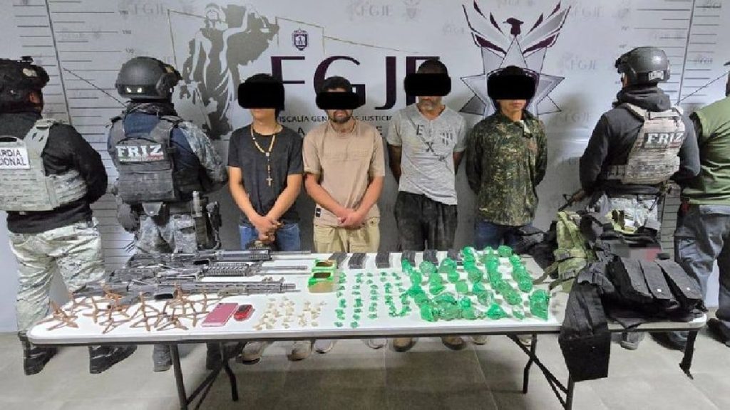 Entre los detenidos destaca Flavio Alberto N., de 38 años, señalado como líder criminal en el municipio de Tabasco, Zacatecas. Junto a él fueron capturados Alberto N., Claudio N. y Juan Carrera N., tras un enfrentamiento que derivó en narcobloqueos con vehículos incendiados en el tramo Villanueva-Jalpa.
