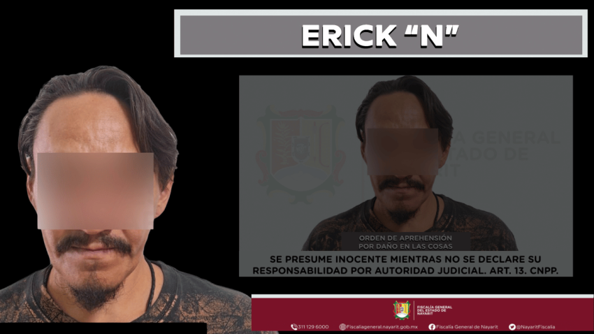 La Fiscalía del estado de Nayarit informó que ejecutaron una orden de aprehensión en la localidad Sayulita, municipio de Bahía de Banderas contra quien fue identificado como Erick “N”, por su probable participación en hechos que para la ley configuran el delito de daño en las cosas, cometido en perjuicio de una persona de sexo masculino de la cual se reserva la identidad para salvaguardar su privacidad e integridad.