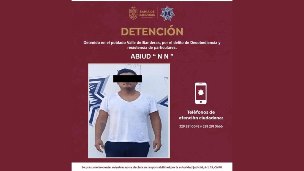 La Dirección de Seguridad Ciudadana y Tránsito Municipal de Bahía de Banderas informó sobre la detención de dos hombres identificados como Abiud “N” y Blair “N”, quienes fueron asegurados por elementos policiales tras incurrir en el delito de desobediencia y resistencia a particulares.