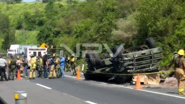 El accidente se dio sobre la autopista Guadalajara-Tepic, e informa el personal de rescate que llegó al lugar y al momento se reporta el saldo de dos militares muertos, uno de los cuales está prensado debajo del camión volcado en la cabina y el otro fuera del camión.