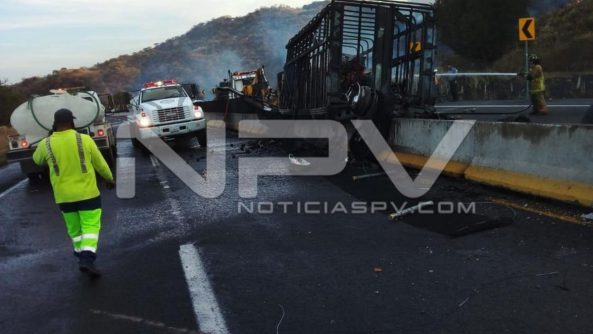 Los hechos ocurrieron en la autopista Tepic-Guadalajara a la altura del kilómetro 110, en donde se registró un incendio originado por un choque entre un trailer que transportaba jicamas y uno más con una cama baja que transportaba maquinaria.