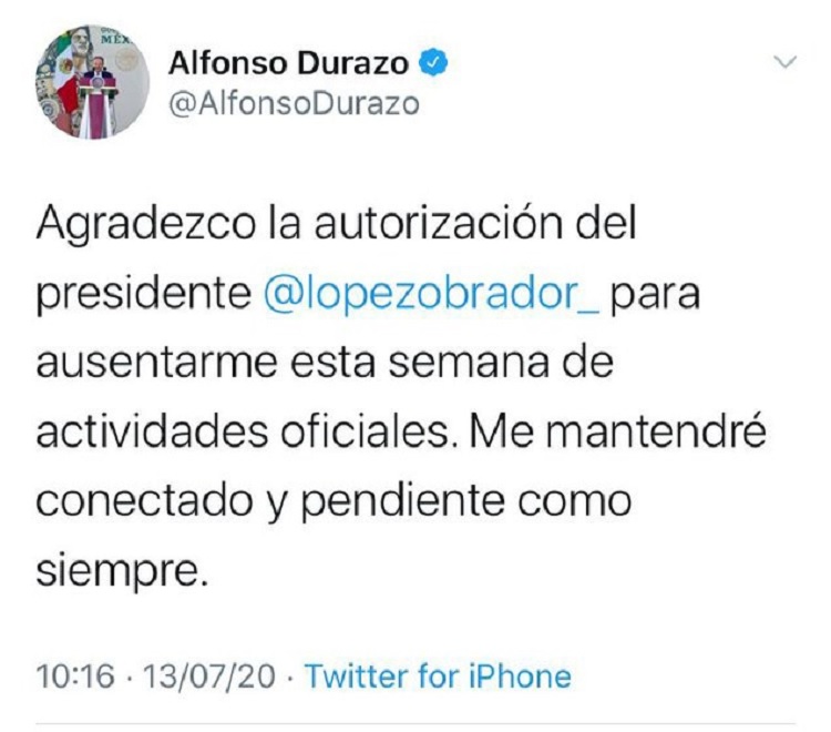 En su cuenta de Twitter el funcionario publicó un mensaje señalando: “Agradezco la autorización del Presidente @lopezobrador_ para ausentarme esta semana de actividades oficiales. Me mantendré conectado y pendiente como siempre.”