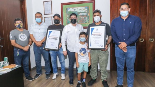 Por los logros obtenidos en cada una de sus disciplinas y poner en alto el nombre de Puerto Vallarta, el presidente municipal interino Jorge Antonio Quintero Alvarado, entregó este jueves reconocimientos al campeón nacional de Footgolf César Cuauhtémoc Díaz Santos Rodríguez, y al entrenador de Muay Thai Pedro López Joya, dos talentosos deportistas orgullosamente vallartenses.