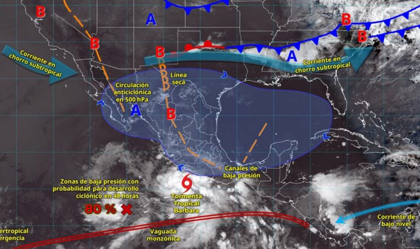 Tres sistemas tropicales activos frente a las costas del Pacífico —incluida la tormenta Bárbara y dos zonas de baja presión, uno próximo a llamarse Cosme— podrían generar una interacción poco común conocida como efecto Fujiwhara, fenómeno que altera trayectorias y complica los pronósticos.