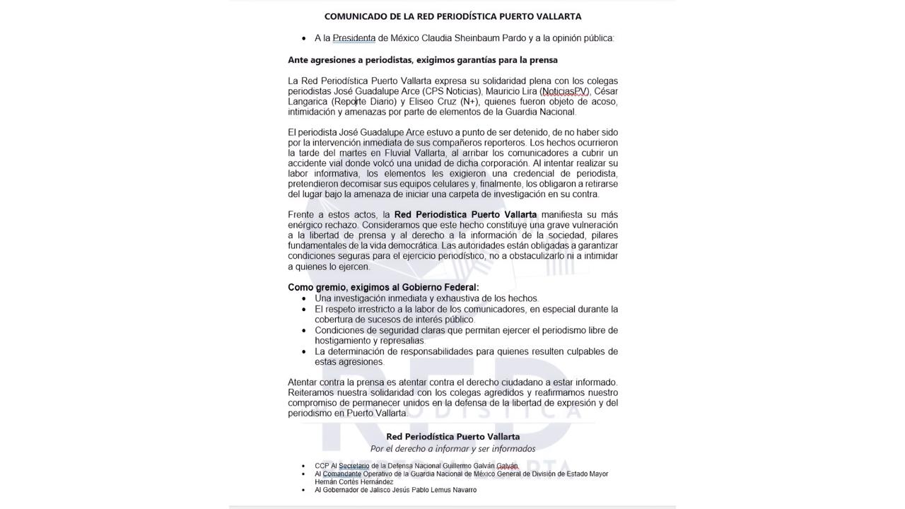 Los reporteros Mauricio Lira (NoticiasPV), Eliseo Cruz (Televisa), Jesús Langarica (Reporte Diario) y José Guadalupe Arce (Tribuna de la Bahía) realizaban transmisiones en vivo cuando personal de la Guardia Nacional que llegó en apoyo comenzó a interferir con su trabajo. De manera directa, los elementos intentaron impedir la difusión del incidente.