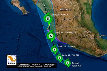 Comunicado SMN | A las 10:00 horas, tiempo del Centro de México, se formó la tormenta tropical Dolores, a partir de la Depresión Tropical 4-E, en el Océano Pacífico. Se localizó aproximadamente a 340 kilómetros (km) al suroeste de Técpan de Galeana, Guerrero, y a 370 km al sur de Lázaro Cárdenas, Michoacán, con vientos máximos sostenidos de 65 kilómetros por hora (km/h), rachas de 85 km/h y desplazamiento hacia el oeste-noroeste a 17 km/h.
