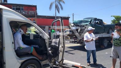 Hasta ese sitio llegaron los agentes de Tránsito Municipal a bordo de sus unidades quienes informan que se trata de un choque entre un taxi colectivo de la ruta Valle de Banderas – Nuevo Vallarta, de la marca Toyota, Hiace, tipo Urvan, de color blanco con placas 94-21-MDE de Nayarit y una camioneta Ford, Ranger, de color verde, con placas JT-43-373 de Jalisco, donde se apreciaban personas lesionadas, dos de ellas que estaban atoradas entre las fierros retorcidos de la unidad del transporte público.