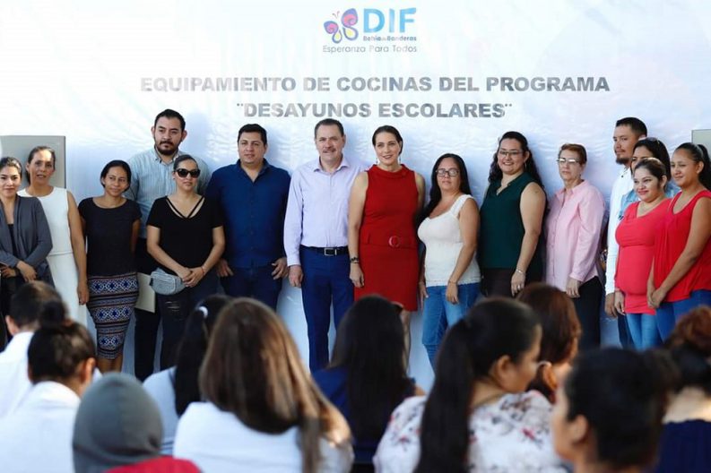 La mañana de este martes, la presidenta del Sistema DIF, L.T.S. Ana Esperanza Berumen de Cuevas y el presidente municipal de Bahía de Banderas, doctor Jaime Cuevas Tello, hicieron entrega de artículos electrodomésticos y utensilios para la elaboración de alimentos, a los comités del programa de Desayunos Escolares de 19 planteles educativos de preescolar y primaria.