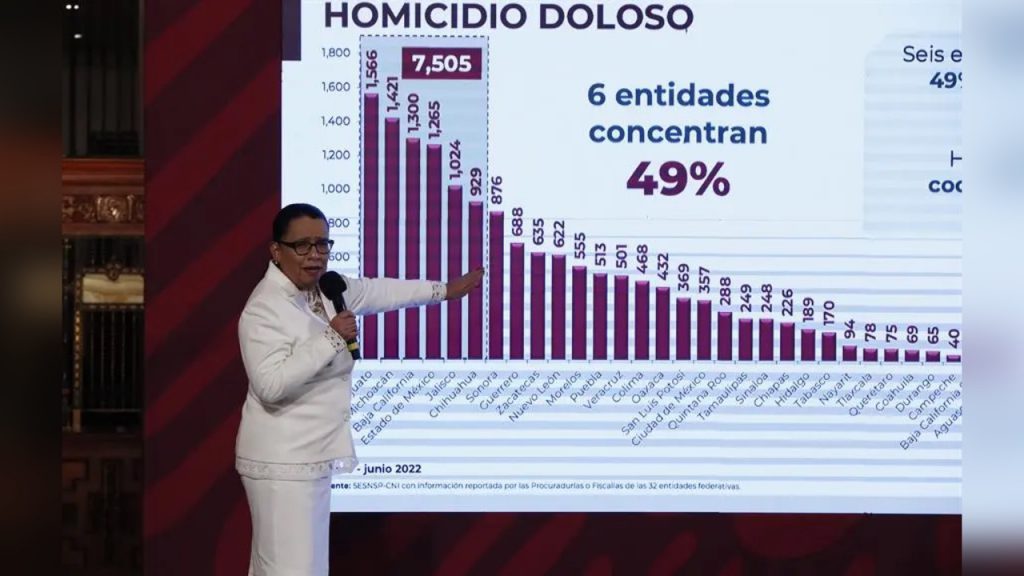 En conferencia de prensa desde Palacio Nacional, Rosa Icela Rodríguez, titular de la SSPC, detalló que en enero se registraron 79 feminicidios; en febrero 83; en marzo 75; en abril 83; y en mayo 84. En su conjunto, en los primeros 6 meses del año, se han registrado 493 feminicidios, en contraste con los 536 contabilizados en el primer semestre de 2021.