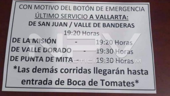 Mientras que en el municipio de Bahía de Banderas, dieron a conocer que el último servicio de San Juan de Abajo y Valle de Banderas, serán a las 19:20 horas.