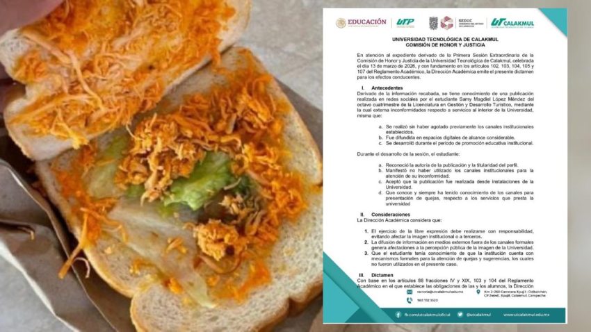 Lo que inició como una inconformidad cotidiana por la calidad de un sándwich en la cafetería escolar, escaló a una grave denuncia de persecución institucional y violación a la libertad de expresión. Sami Magdiel López Méndez, estudiante de octavo cuatrimestre en la Universidad Tecnológica de Calakmul, denunció que la Comisión de Honor y Justicia de su plantel le ordenó ofrecer una disculpa pública y someterse a una valoración psicológica obligatoria para determinar si es «apto» para seguir estudiando.
