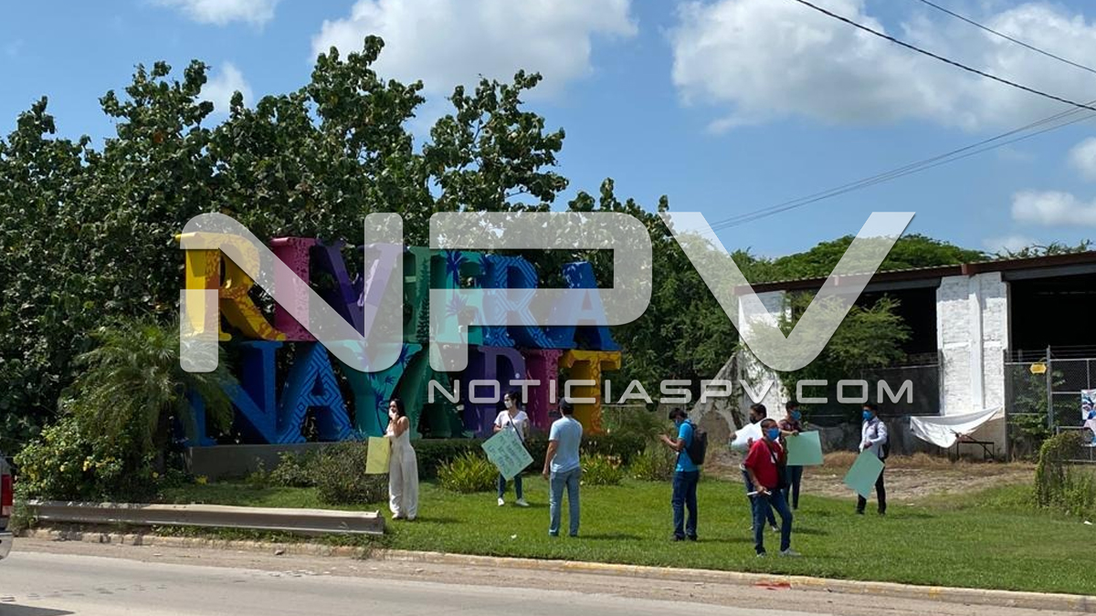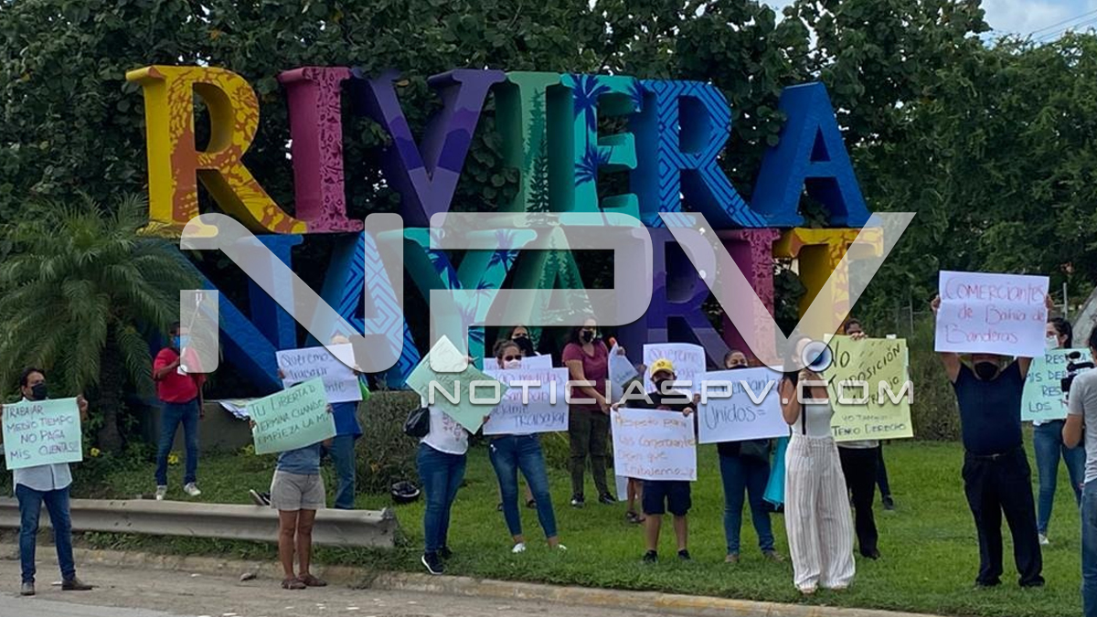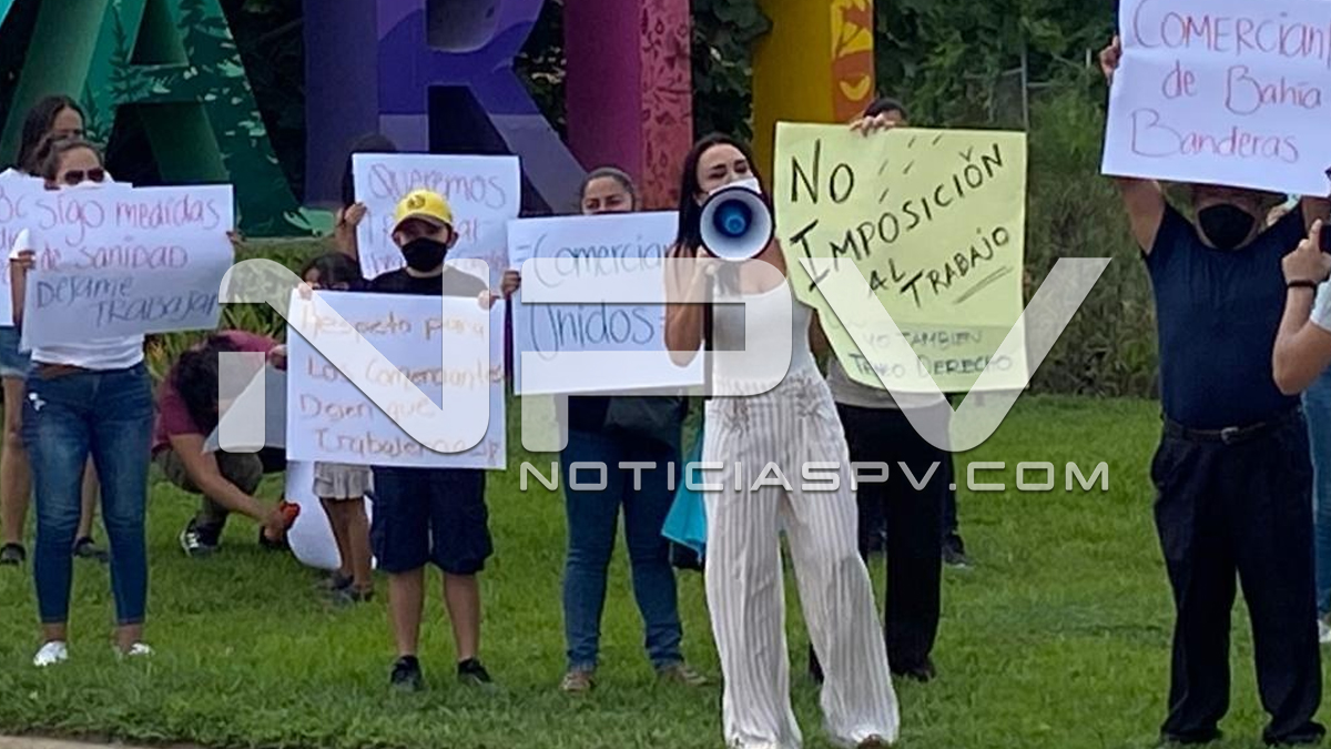 Encabezados por la ex diputada priista local, Patricia Sandoval, menos de 20 personas se postraron en las inmediaciones de las letras de bienvenida de Bahía de Banderas, en reclamo al gobierno porque no se les permite la reapertura de sus negocios no esenciales.