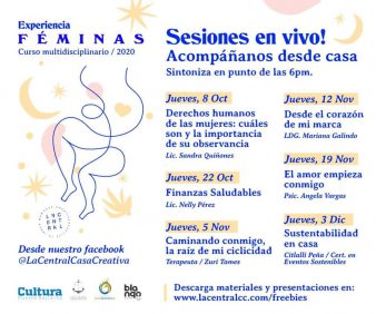 Las sesiones se imparten los días martes y jueves a las 18:00 horas. Si bien los cupos están agotados para las siguientes actividades, las mujeres interesadas pueden seguir la transmisión en vivo y descargar los materiales didácticos de talleres seleccionados a través de las redes sociales del IVC, Canal del Puerto, La Central Casa Creativa y en el sitio web www.lacentralcc.com