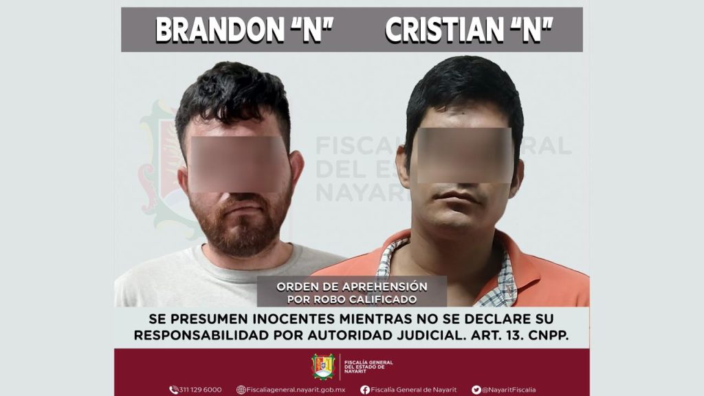 La Fiscalía General del Estado de Nayarit informó la detención de dos hombres identificados como Brandon “N” y Cristian “N”, quienes son señalados por su presunta participación en el delito de robo calificado en perjuicio de un hombre, cuya identidad se mantiene bajo reserva por razones legales.
