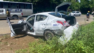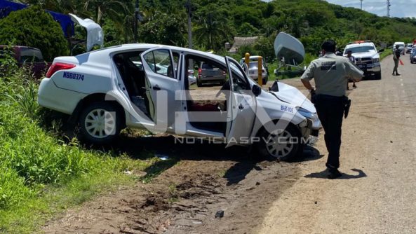 Fuerte accidente se registró por la carretera a Punta de Mita, frente al ingreso al hotel Palladium donde chocaron una góndola cargada de piedra y un taxi de Nuevo Vallarta, resultando varias personas lesionadas que fueron llevadas a recibir atención médica a un hospital en ambulancias privadas, desconociéndose hasta el momento su estado de salud, haciéndose cargo de tomar nota los oficiales de la Guardia Nacional (División Caminos.